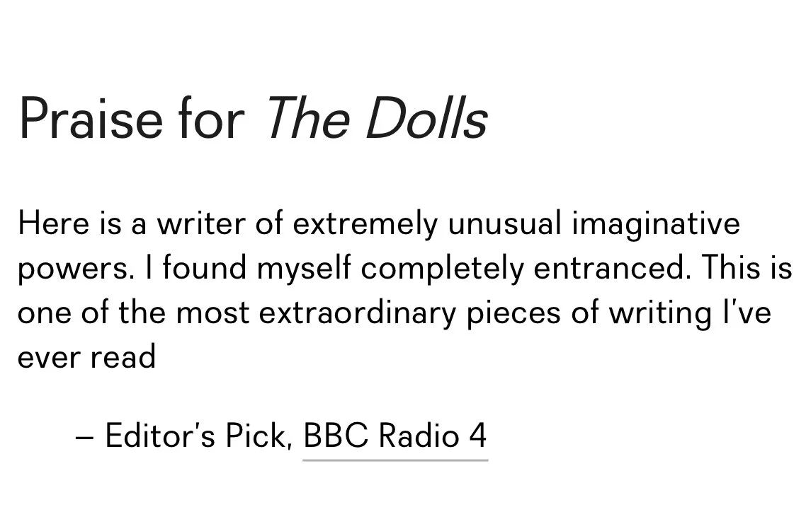 Bernur writes that Scavenius “strengthens her position in the Nordic region as one of the few genuinely innovative prose writers,” while BBC Radio 4 called The Dolls “one of the most extraordinary pieces of writing I’ve ever read.” The Irish Times praised its “rigorous inventiveness,” Asymptote its “peculiar and gritty prose,” and POV International its grey-toned universe of “ethical and moral degradation… supremely well-written.”