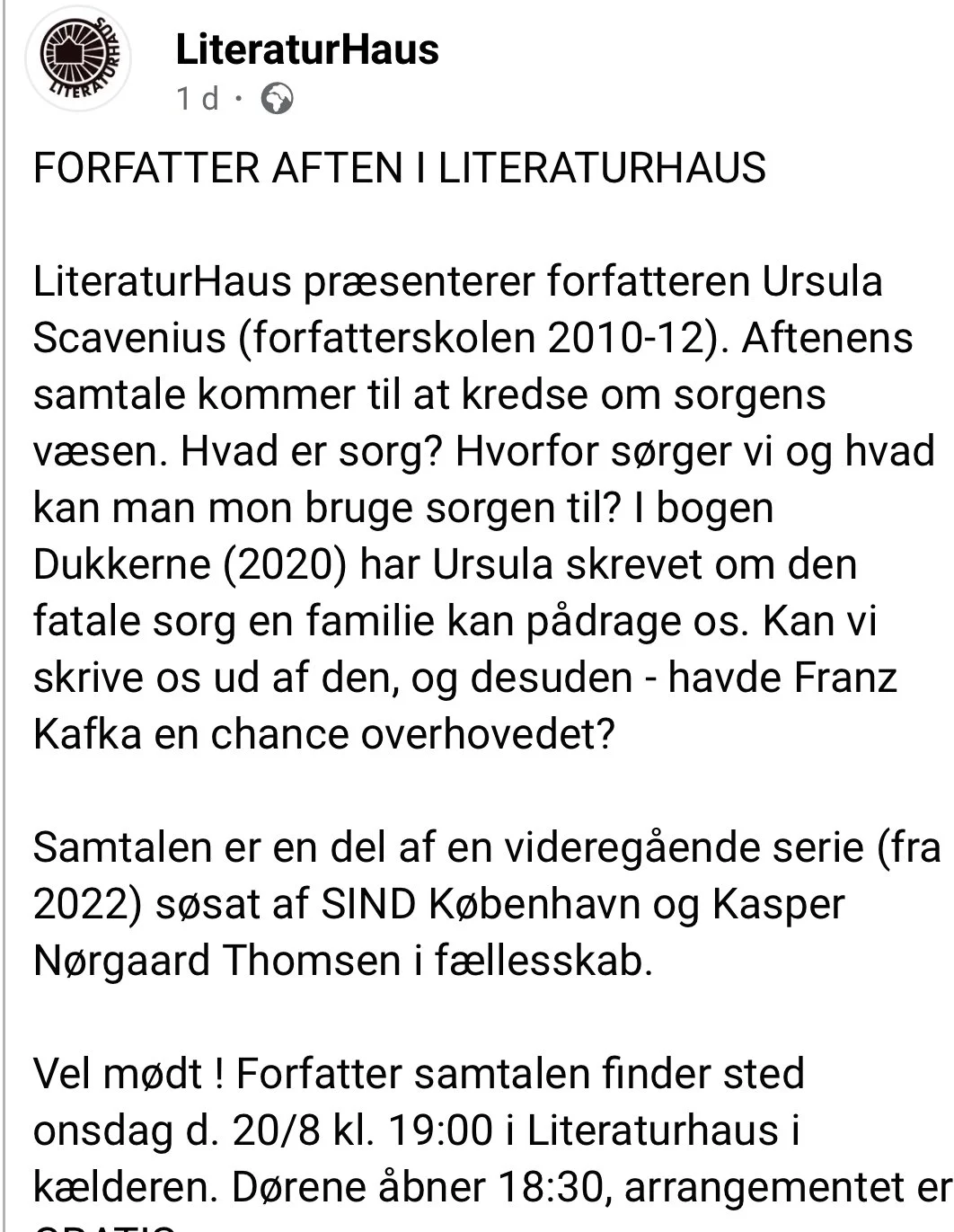 “Thrilled to have Danish short story writer Ursula Catharina Scavenius join us there on Saturday at 4 pm for one of our events.